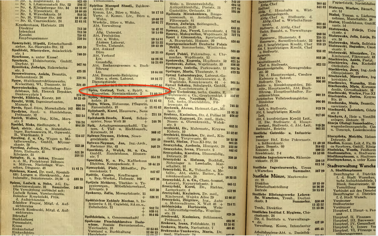 1942 – Gertrude Spiro appears in the General Government Directory as the manager of a liquor and cigarette shop at No. 2 Nowiniarska St., and as residing at 28 Tamka St. in Warsaw.